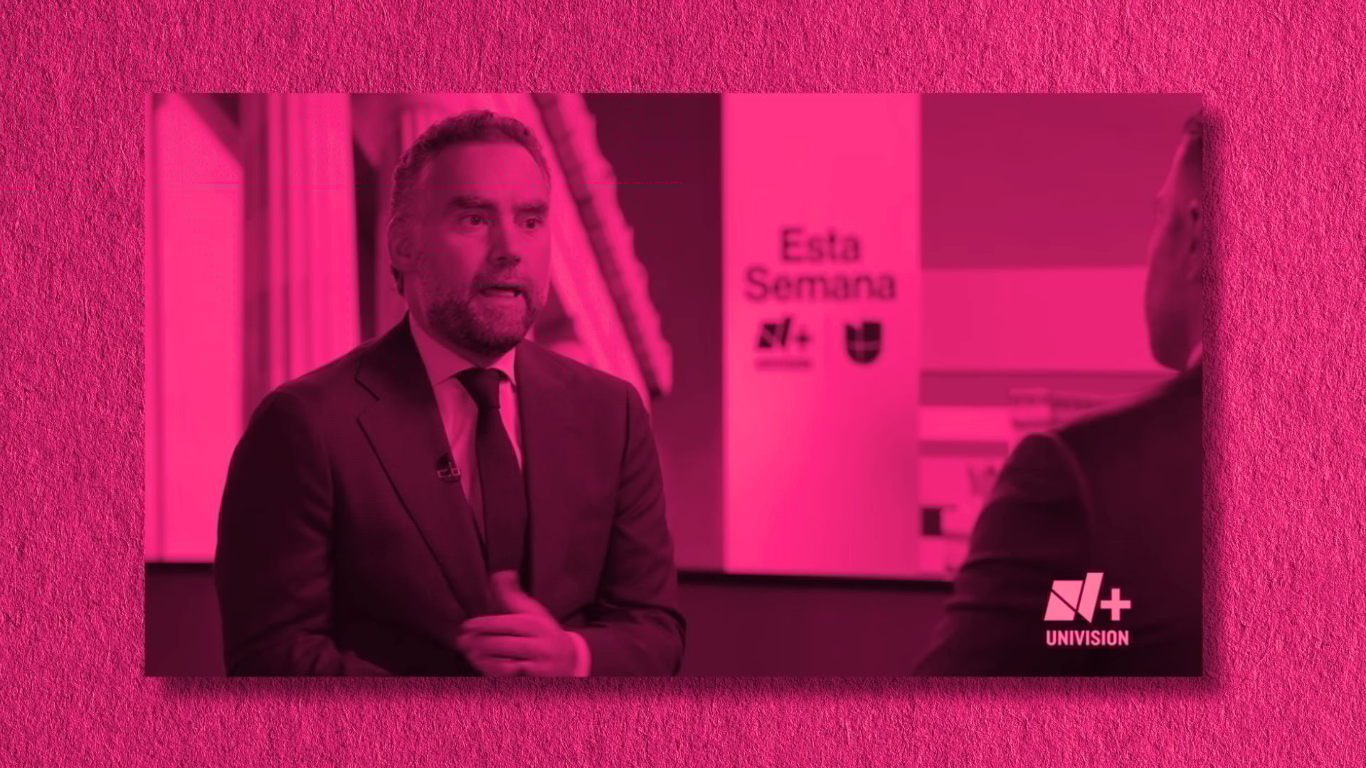 Photo: Enrique Acevedo, who used to work for Univision as a news anchor, interviews Mexico security chief Omar García Harfuch on “Esta Semana.” (N+ Univisión/In The Hyphen composite)